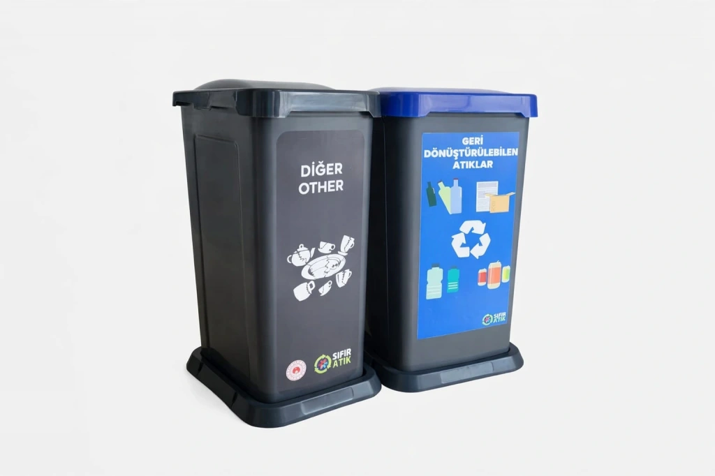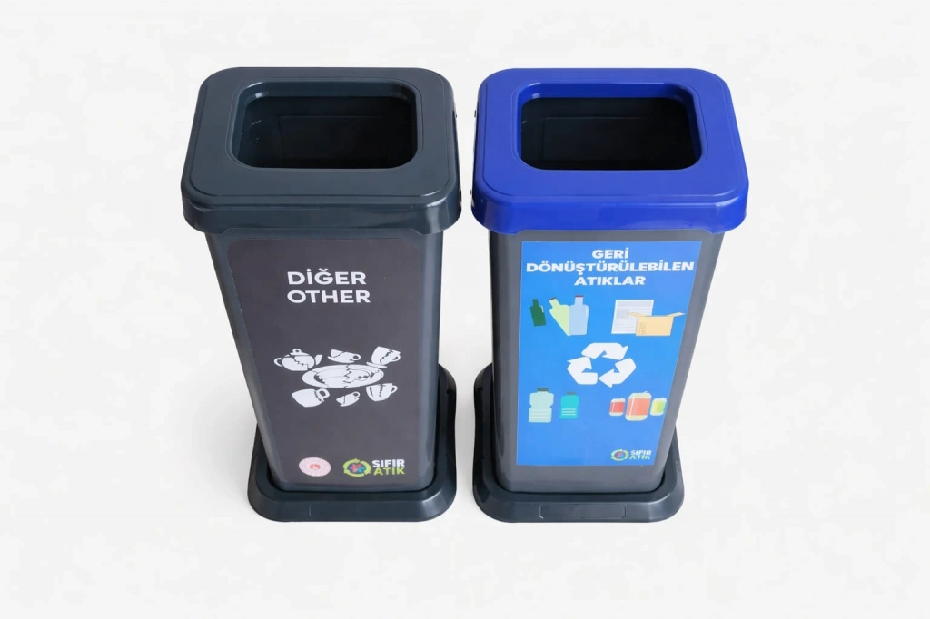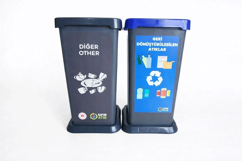 Gerikazanılabilen Atıklar için mavi kumbara ve Diğer (geri dönüştürülemeyen) atıklar için koyu gri renk kumbara kullanılmaktadır.